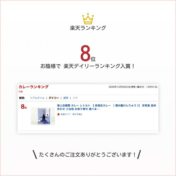 【海上自衛隊最強レシピ 艦めしとは】 「艦めし」とは、海上自衛隊の艦艇で、隊員たちに食べられている食事のことです。 そのレシピは「必要な栄養を補給」「体力の維持増進」「部隊の人的戦闘力の発揮」という3つの目的をクリアした、とっても美味しいメニューばかり。 日本の海を渡る、縁の下の力持ちなんです。 「艦の数だけ味がある」というのも、艦めしの魅力。 海上自衛隊のサイトでは、有名なカレーをはじめ、和洋中合わせてなんと250種ものレシピが公開されています。 本商品の後も、艦めしの奥深い世界を楽しんでいただけたら嬉しいです。 ※海上自衛隊ホームページより引用 【潜水艦ずいりゅう「ポークカレー」】 飴色玉ねぎや素揚...