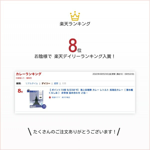 制作協力:海上自衛隊 呉地方総監部 海上自衛隊呉基地・艦艇のカレーが味わえると人気の「呉海自カレー」が 家でも気軽に味わえるようレトルトパウチになって登場。 海上自衛隊の艦艇で食べられているカレーと同じ味をいつでも楽しめます。 潜水艦くろしおのカレーは牛すじを使い、中華風ベースに「くろしお」独自の隠し味で、広島風味の材料で仕上げた味わい深い一杯。 お土産としても人気です。 【甘辛レベル 4】 内容量:180g(1人前) ------------------------- 「呉海自カレー」関連グッズ一覧 「カレー」関連グッズ一覧 関連商品海上自衛隊 カレー レトルト 【 呉海自カレー ( 潜水艦けんりゅう...海上自衛隊 カレー レトルト 呉海自カ...