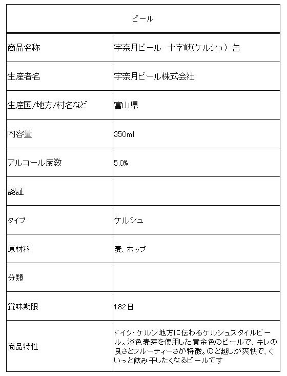 【商品説明】キレの良さとフルーティーさが特徴。のど越しが爽快で、ぐいっと飲み干したくなるビールです【仕様】●内容量:350ml●生産地:富山県●メーカー:宇奈月ビール株式会社【備考】【賞味期限2025.12.20】【検索用キーワード】宇奈月ビール うなづきビール ウナヅキビール UNAZUKI BEER 十字狭 じゅうじきょう ジュウジキョウ ケルシュ 350ml 350ミリリットル 1本 1缶 5度 5% ドイツ エールビール 缶ビール BEER アルコール飲料 お酒 国産ビール ビール類 地ビール・クラフトビール 北陸 中部 東日本 わけあり 訳あり アウトレット 賞味期限間近 廃棄 fd_loss フードロス H20524【賞味期限2025.12.20】