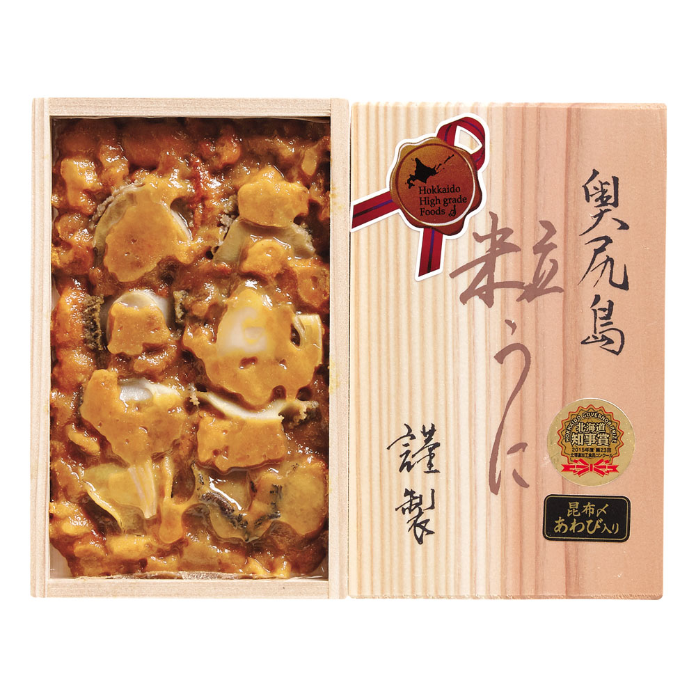 北海道奥尻島で育つキタムラサキウニをミョウバンを一切使わず塩のみで味付けした塩うに。酒のつまみやプレゼントに人気の商品です