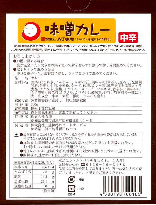 内容量:200g(箱入、1人前)、中辛(甘辛味) バラ売り、合わせ買いにもどうぞ。 愛知県岡崎市名産『カクキュー』の八丁味噌(調味みそに占める割合16%)入りの味噌カレーです。 コトコトじっくり煮込んで大切に仕上げました。素材・味・健康にこだわった料理旅館呑龍がお届けする、やさしく、どこか懐かしい味のするカレーです。 八丁味噌の甘味とコクが、カレーのスパイスと意外にも似合います。ほんのり和風の味はカレーうどんにも最適です。是非ご賞味ください。 【商品開発の背景】 料理旅館呑龍は、愛知県豊川市の三河湾を一望できる御津山の頂きで「味」と「おもてなし」の宿を開いておよそ50年です。隠れ宿的存在として多くのお客...