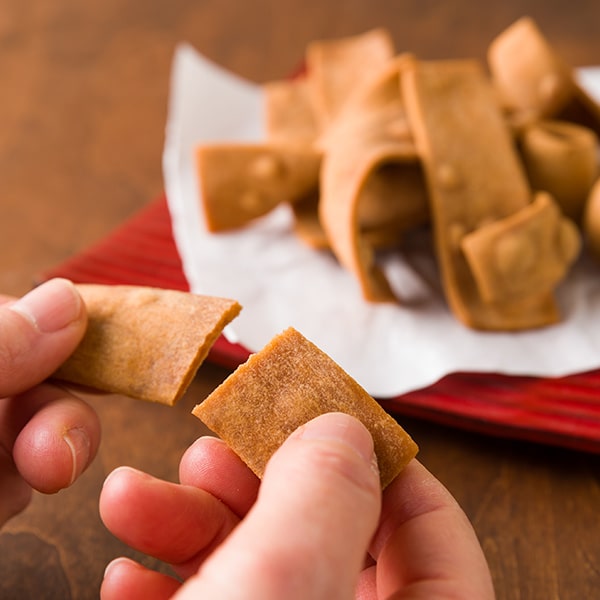 とちのみ本舗大福城の人気商品、一度食べたらとまらない「とちの実かりんとう」は、短冊のような形で、薄くて食べやすいのが特徴です。